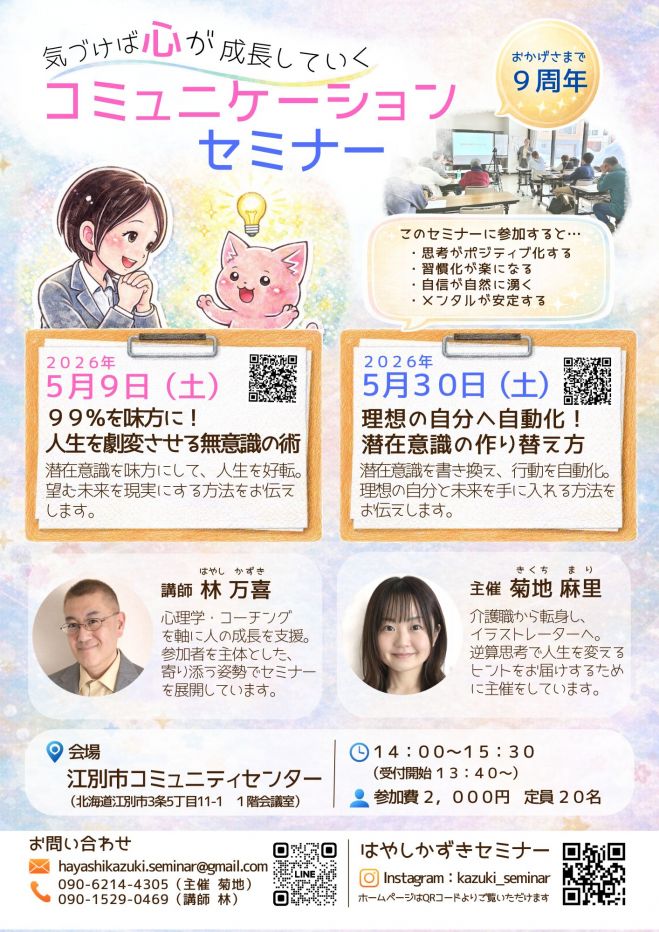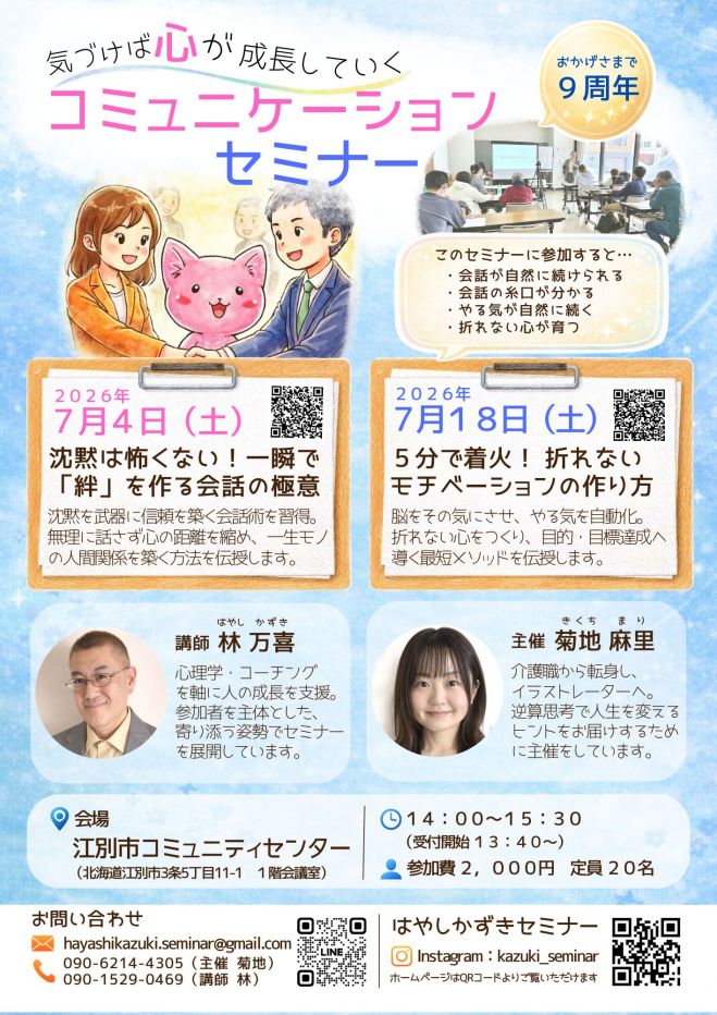 セミナーのお知らせ 一覧 2022.07.102026.04.12 今後開催予定のセミナー一覧をご紹介します。 セミナー参加者様からの感想はこちら▶ R8年4月セミナー 江別セミナー 詳しい内容・申込 詳しい内容・申込 オンラインセミナー 詳しい内容・申込 詳しい内容・申込 R8年5月セミナー 江別セミナー 詳しい内容・申込 詳しい内容・申込 オンラインセミナー 詳しい内容・申込 詳しい内容・申込 R8年6月セミナー 江別セミナー 詳しい内容・申込 詳しい内容・申込 オンラインセミナー 詳しい内容・申込 詳しい内容・申込 R8年7月セミナー 江別セミナー 詳しい内容・申込 詳しい内容・申込 オンラインセミナー 詳しい内容・申込 詳しい内容・申込 戻る